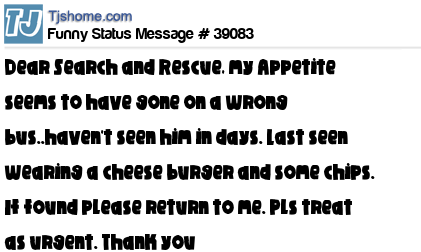 X is Dear Search and Rescue, my Appetite seems to have gone on a wrong bus..haven't seen him in days. Last seen wearing a cheese burger and some chips. If found please return to me. Pls treat as urgent. Thank you