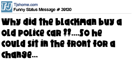 X is Why did the blackman buy a old police car ??....So he could sit in the front for a change...