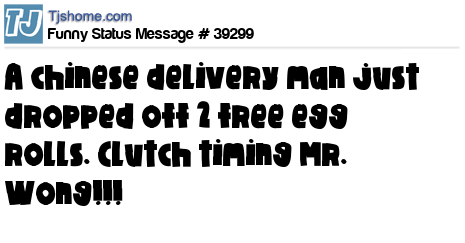 X says A chinese delivery man just dropped off 2 free egg rolls. Clutch timing Mr. Wong!!!