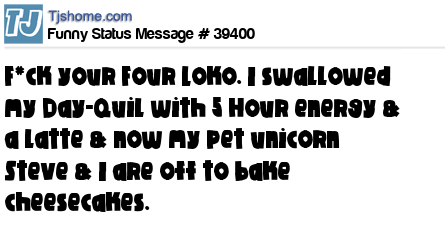 X  F*ck your Four Loko. I swallowed my Day-Quil with 5 Hour energy & a latte & now my pet unicorn Steve & I are off to bake cheesecakes.
