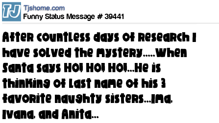 X says After countless days of research I have solved the mystery.....When Santa says HO! HO! HO!...He is thinking of last name of his 3 favorite naughty sisters...Ima, Ivana, and Anita...