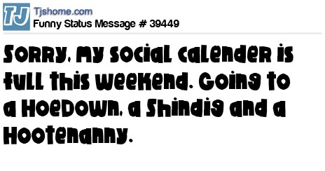 X has Sorry, my social calender is full this weekend. Going to a HoeDown, a Shindig and a Hootenanny.