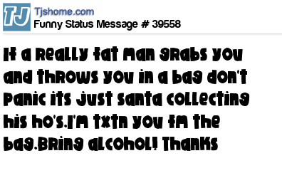 - # 39859 If a real fat man grabs you & throws you in a bag don't panic it's just santa collecting his ho's. I'm updating this in the bag. Bring alcohol!