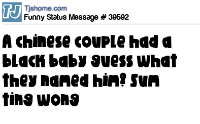 - # 42721 A chinese couple had a black baby guess what they named him? Sum ting wong