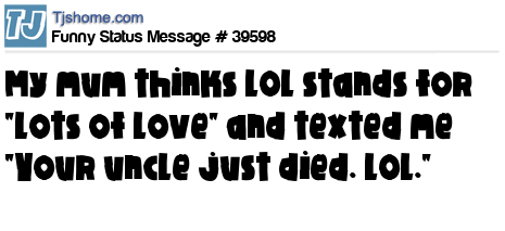 - # 74399 My mom thinks LOL stands for "lots of love" and texted me "Your Grandma just died. LOL." :)