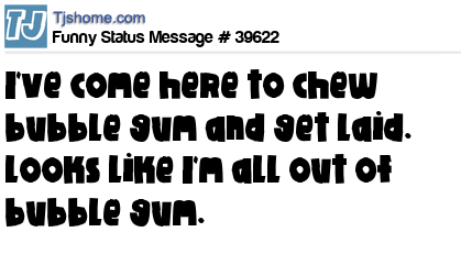 X I've come here to chew bubble gum and get laid. Looks like I'm all out of bubble gum.