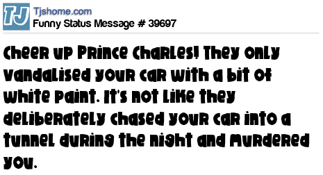X Cheer up Prince Charles! They only vandalised your car with a bit of white paint. It's not like they deliberately chased your car into a tunnel during the night and murdered you.