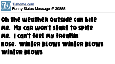 - # 190698 Oh, the weather outside can bite me. My car won't start to spite me. I can't feel my freakin' toes. Winter blows, Winter blows, Winter blows.