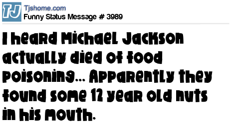 X says I heard Michael Jackson actually died of food poisoning... Apparently they found some 12 year old nuts in his mouth.