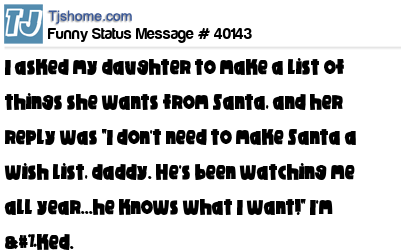 X I asked my daughter to make a list of things she wants from Santa, and her reply was "I don't need to make Santa a wish list, daddy. He's been watching me all year...he knows what I want!" I'm %ked.