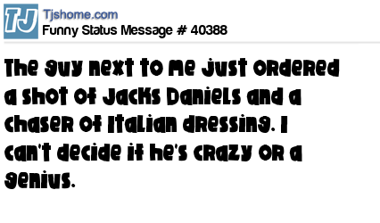 X The guy next to me just ordered a shot of Jacks Daniels and a chaser of Italian dressing. I can't decide if he's crazy or a genius.