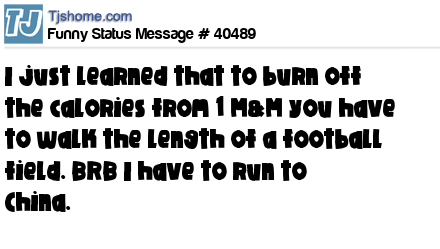 X  I just learned that to burn off the calories from 1 M&M you have to walk the length of a football field. BRB I have to run to China.