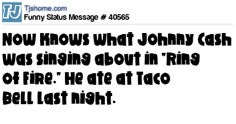 - # 36576 I must have ordered the "Johnny Cash" at Taco Bell cuz now I'm experiencing a "Ring of Fire" in the bathroom!