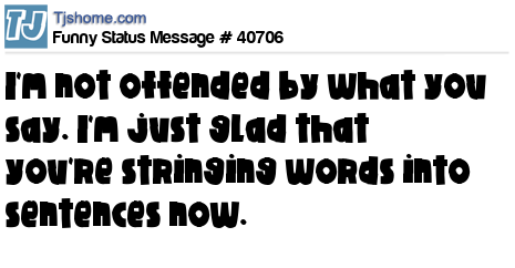 X I'm not offended by what you say. I'm just glad that you're stringing words into sentences now.