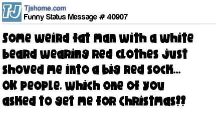 X is some weird fat man with a white beard wearing red clothes just shoved me into a big red sock... OK people, which one of you asked to get me for Christmas??