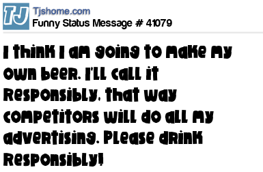 - # 28215 I'm thinking about making my own brand of beer and call it, "Responsibly." That way I would get free advertising from all my competitors. "Please drink Responsibly."