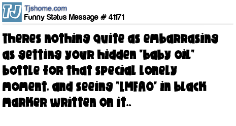 X says theres nothing quite as embarrasing as getting your hidden "baby oil" bottle for that special lonely moment, and seeing "LMFAO" in black marker written on it..