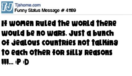 - # 36923 if women ruled the world there would be no wars. just a bunch of jealous countries not talking to each other.