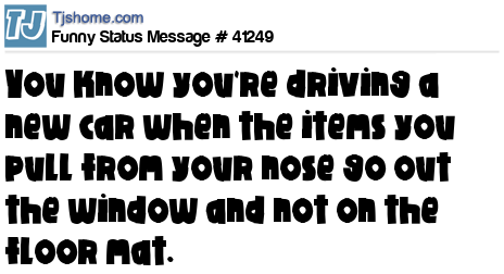 X is You know you're driving a new car when the items you pull from your nose go out the window and not on the floor mat.