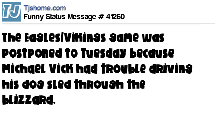 X The Eagles/Vikings game was postponed to Tuesday because Michael Vick had trouble driving his dog sled through the blizzard.