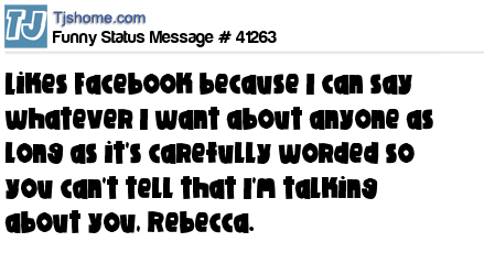 - # 23666 I like Facebook because I can say whatever I want about anyone as long as it's carefully worded so you can't tell that I'm talking about you, Sarah.