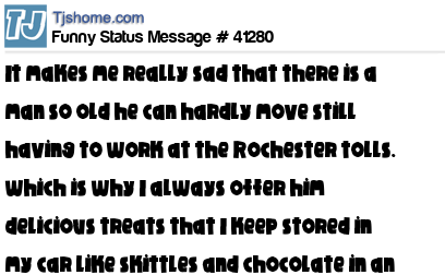 X is it makes me really sad that there is a man so old he can hardly move still having to work at the Rochester tolls. which is why I always offer him delicious treats that I keep stored in my car like skittles and chocolate in an attempt to make his day :)