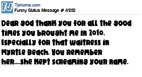 X Dear god thank you for all the good times you brought me in 2010. Especially for that waitress in Myrtle Beach. You remember her....she kept screaming your name.