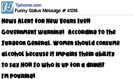 - # 120593 News Alert for New Years Eve!! Government warning!!! According to the Surgeon General: When women consume alcohol, it impairs their ability to say “no”! So.... who's buying me a drink?