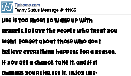 X Life is too short to wake up with regrets.So love the people who treat you right. Forget about those who don't. Believe everything happens for a reason. If you get a chance, take it, and if it changes your life, let it. Enjoy life: you only have one!