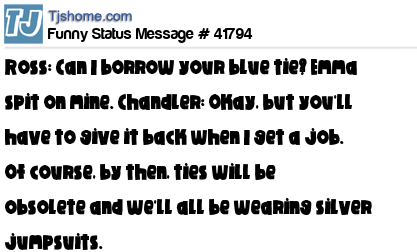 X is Ross: Can I borrow your blue tie? Emma spit on mine. Chandler: Okay, but you'll have to give it back when I get a job. Of course, by then, ties will be obsolete and we'll all be wearing silver jumpsuits.