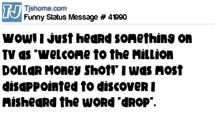 X Wow! I just heard something on TV as "Welcome to the Million Dollar Money Shot!" I was most disappointed to discover I misheard the word "drop".