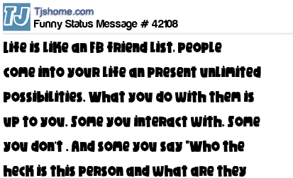 X says Life is like an FB friend list, people come into your life an present unlimited possibilities. What you do with them is up to you. Some you interact with. Some you don't . And some you say "Who the heck is this person and what are they doing in my life?