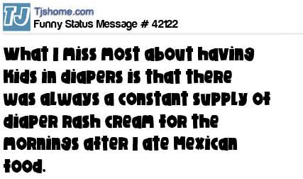 X What I miss most about having kids in diapers is that there was always a constant supply of diaper rash cream for the mornings after I ate Mexican food.