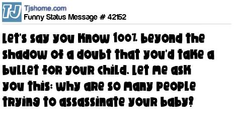 - # 98875 My friend just had a baby. He keeps going on about how he would kill anyone who tried to hurt his child, or he would get run over to save his son. He would even take a bullet for his boy. I said, “Why are so many people trying to assassinate your baby?â