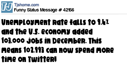 X Unemployment rate falls to 9.4% and the U.S. economy added 103,000 jobs in December. This means 102,993 can now spend more time on Twitter!