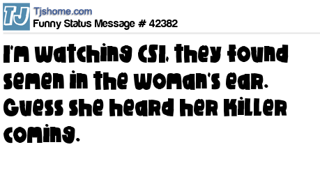 X says I'm watching CSI, they found semen in the woman's ear. Guess she heard her killer coming.