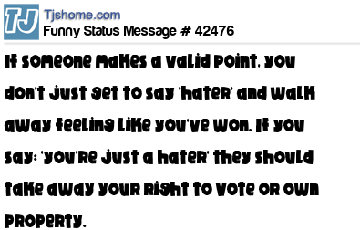 X If someone makes a valid point, you don't just get to say 'hater' and walk away feeling like you've won. If you say: 'you're just a hater' they should take away your right to vote or own property.