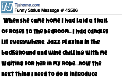 X •When she came home I had laid a trail of roses to the bedroom...I had candles lit everywhere, jazz playing in the background and wine chilling with me waiting for her in my robe...now the next thing I need to do is introduce myself......