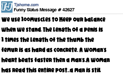 X is We use 300muscles to keep our balance when we stand, The length of a penis is 3 times the length of the thumb the femur is as hard as concrete. A woman's heart beats faster then a man's.A woman has read this entire post..a man is stil lookin at his thumb