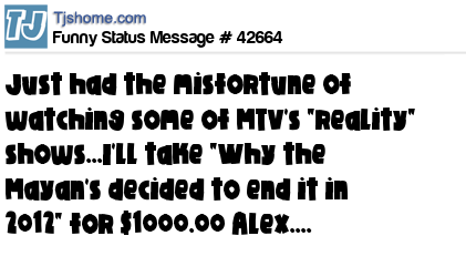 X Just had the misfortune of watching some of MTV's "reality" shows...I'll take "Why the Mayan's decided to end it in 2012" for $1000.00 Alex....