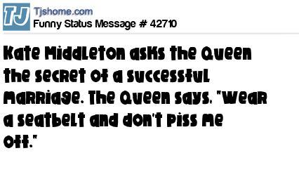 - # 44569 Kate Middleton has asked the Queen for advice on her marriage and the Queen said "Wear a seatbelt and don't piss me off."