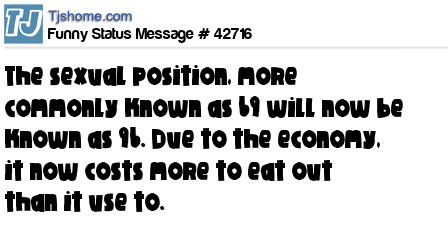 - # 17008 The sexual position 69 is now 96, due to the poor economy the price of eating out has gone up