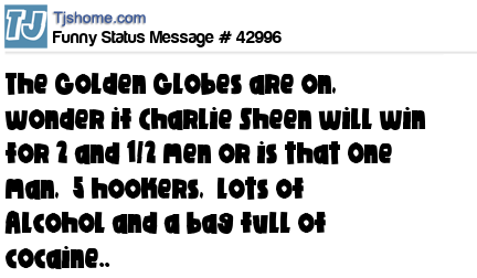 X is The Golden Globes are on, wonder if Charlie Sheen will win for 2 and 1/2 men or is that One man, 5 hookers, lots of Alcohol and a bag full of cocaine..