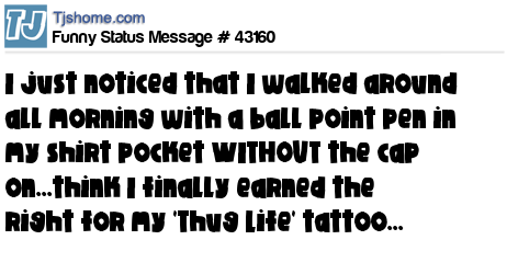 X I just noticed that I walked around all morning with a ball point pen in my shirt pocket WITHOUT the cap on...think I finally earned the right for my 'Thug Life' tattoo...