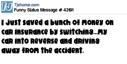 - # 84304 I just saved a bunch of money on car insurance by switching... my car into reverse and driving away from the accident.