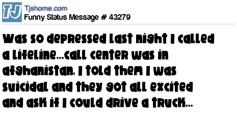 X is was so depressed last night I called a lifeline...call center was in afghanistan, I told them I was suicidal and they got all excited and ask if I could drive a truck...