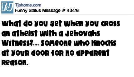 X What do you get when you cross an atheist with a Jehovahs Witness?…. Someone who knocks at your door for no apparent reason.