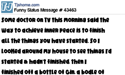 X is Some doctor on TV this morning said the way to achieve inner peace is to finish all the things you have started. So I looked around my house to see things I'd started & hadn't finished, then I finished off a bottle of Gin, a bodle of Baileys, a butle of w