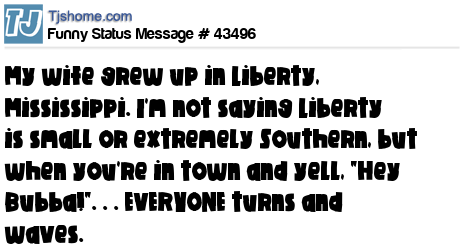X says My wife grew up in Liberty, Mississippi. I'm not saying Liberty is small or extremely Southern, but when you're in town and yell, "Hey Bubba!". . . EVERYONE turns and waves.