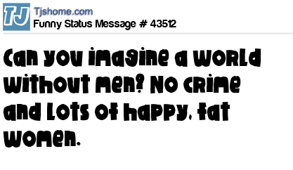 - # 10258 Think about it If there where no men in the world there would be no crime, but all women would be happy, and Fat!